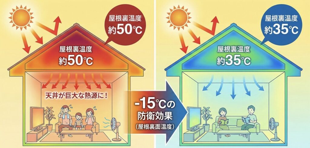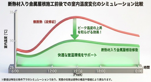 従来の金属屋根リフォームでは、既存の屋根の上に新しい金属板を重ねる際、遮熱や断熱の性能は限られたものでした。しかし、断熱材入り金属屋根材にした場合、暮らしの快適さは劇的に改善されます。