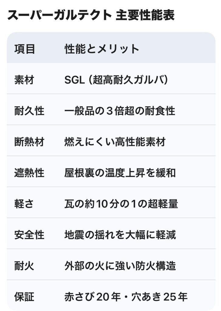 最大の特徴は、鋼板に超高耐久ガルバ(SGL)を採用している点です。従来のガルバリウム鋼板にマグネシウムを2パーセント添加したこの素材は、従来のガルバリウム鋼板に比べて3倍超の耐食性を誇ります。