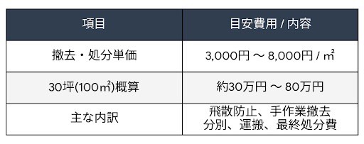 2026年現在、屋根面積約100㎡の場合、アスベスト対応を含む撤去費用は約30万円〜50万円程度が一つの目安です。ただし条件により増減します。