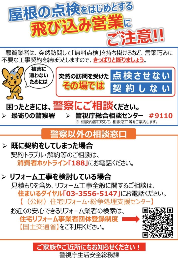 この様な集団が、屋根や住宅に関する詐欺や点検商法に関与している可能性もある為、飛び込みの訪問営業などには注意が必要です。