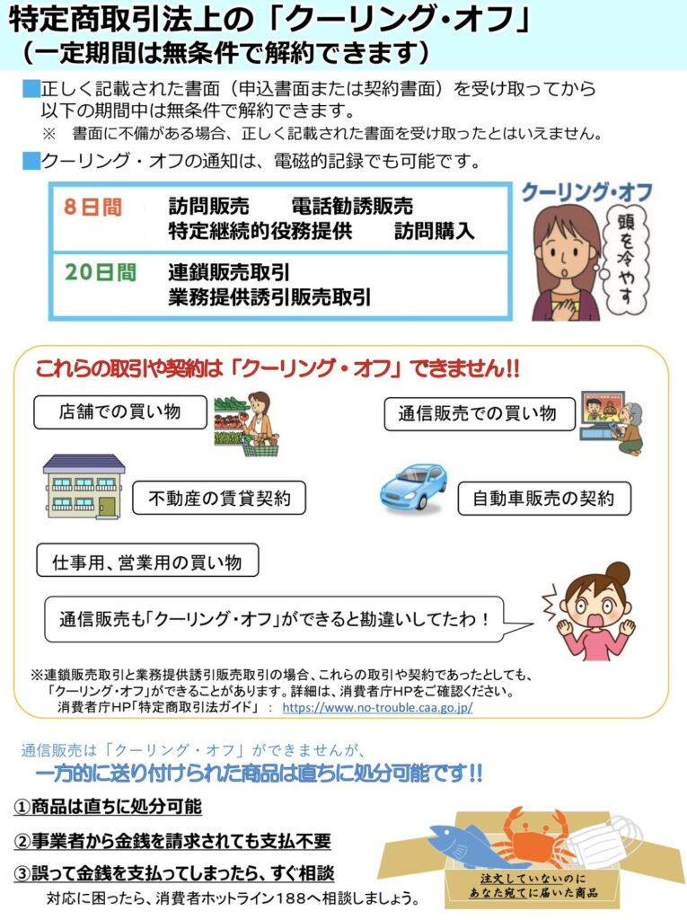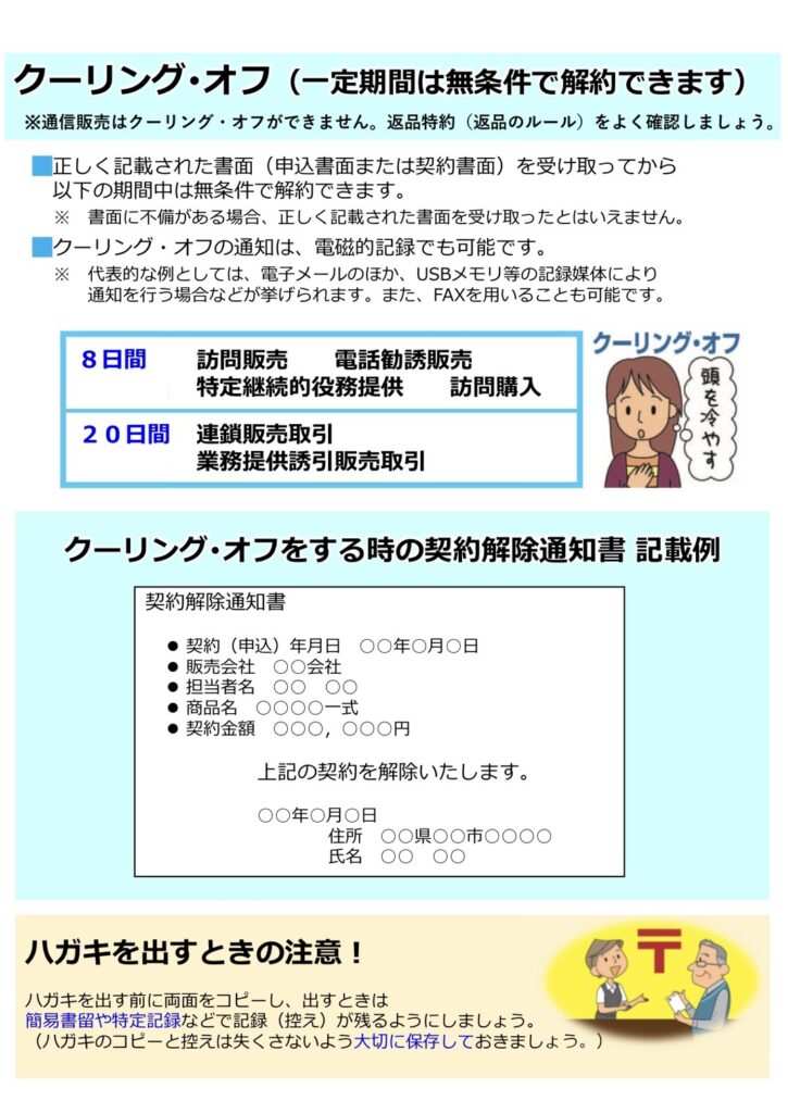 訪問販売による契約であれば、法律で定められた書面を受け取ってから8日以内なら、クーリング・オフ(無条件解除)が可能です。