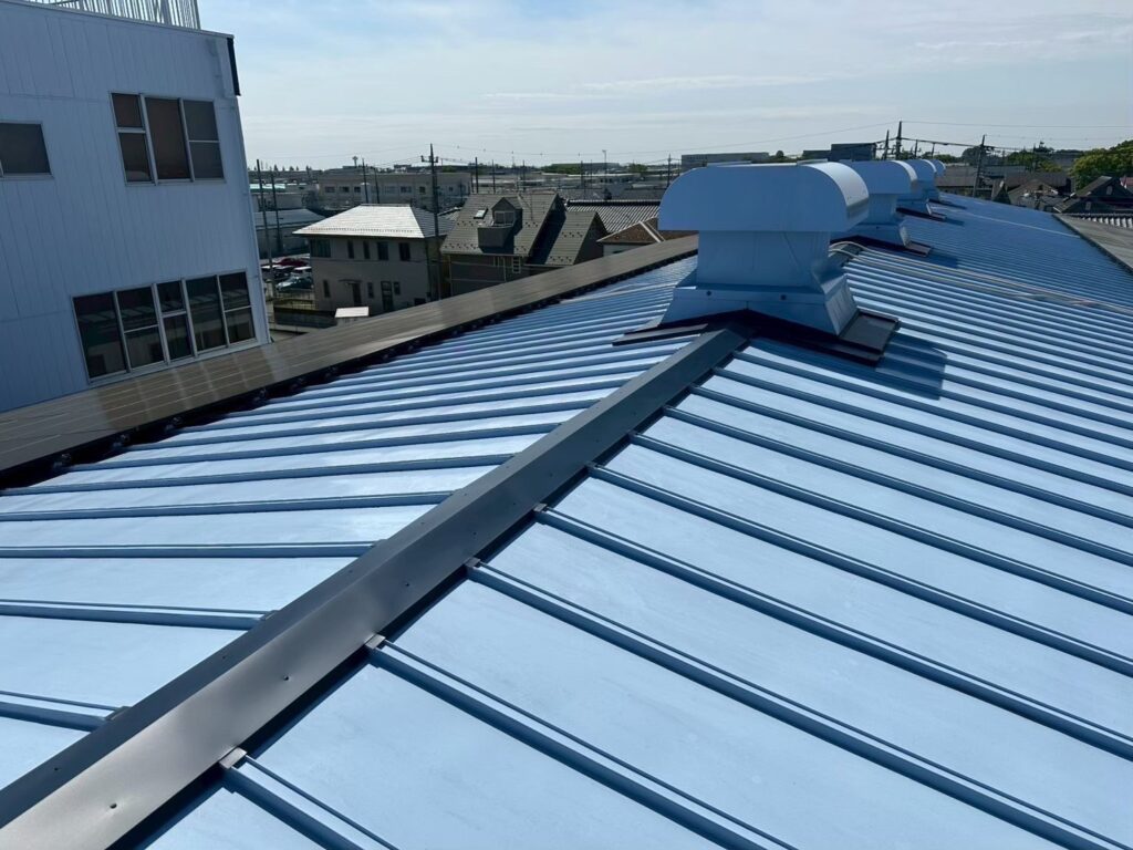 今回使用した屋根材は、稲垣商事のスタンビーTL455という縦葺きタイプの屋根材です。こちらの屋根材は嵌合部は毛細管現象を防ぐ構造で、屋根材の基本性能である高い防水性を備えており見た目も非常に綺麗な屋根材です。屋根が葺き終わったら