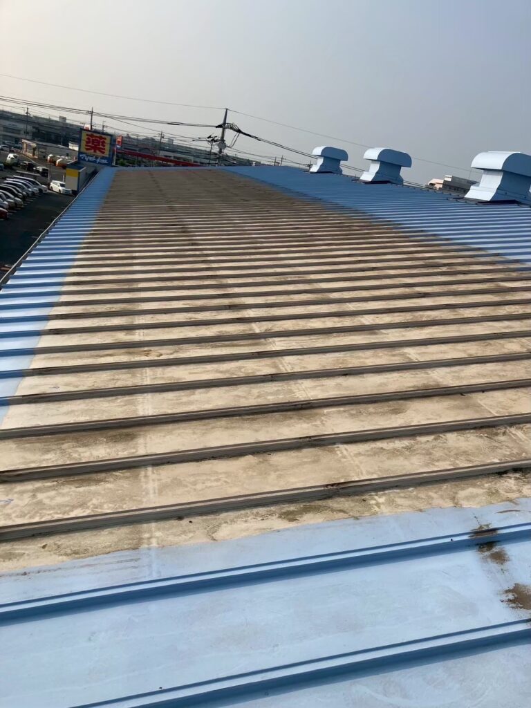この屋根材は年数が経過してくると接合部に埃などが溜まり雨が降ると埃などが雨水を毛細管現象により吸い込み雨漏りを発生させます。雨漏りが発生すると目視での雨漏り箇所の特定が難しい屋根材です。こちらの屋根も倉庫内のあちこちに雨漏りが発生している為、屋根カバー工事を施工する事になりました。