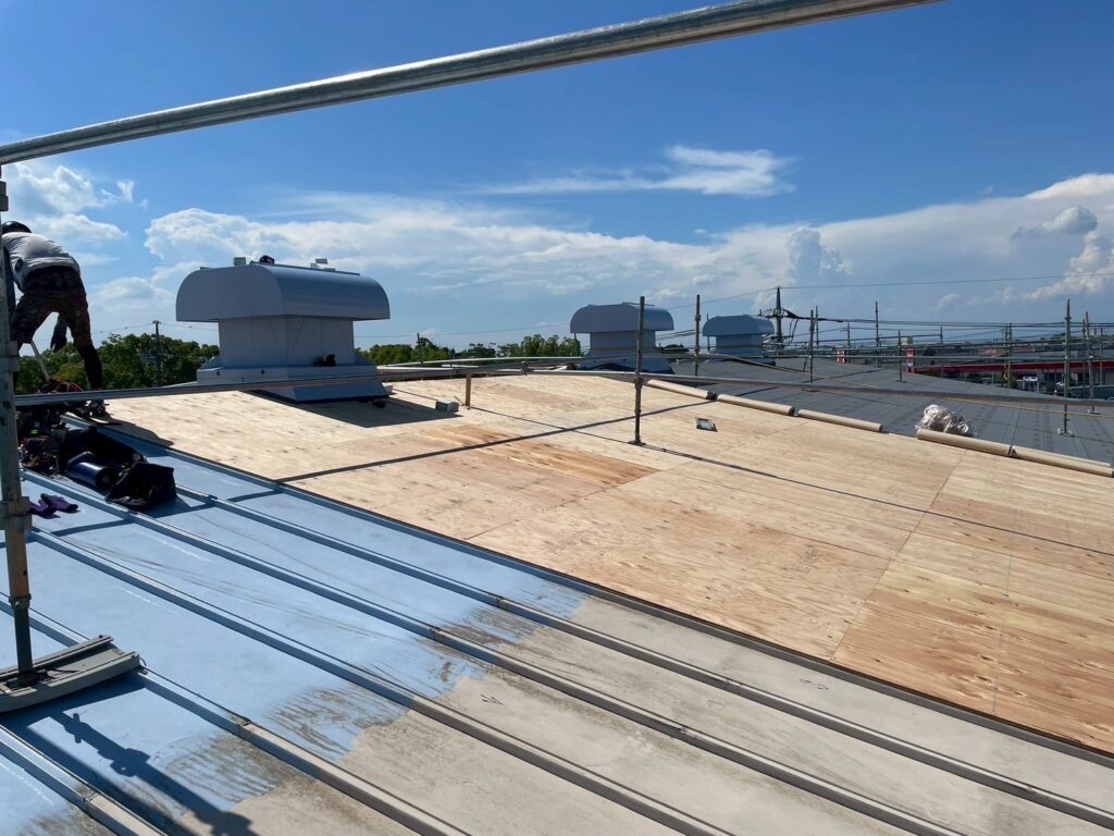 太陽光発電パネルを取り外し終わったら新しい屋根材を取り付ける為に既存屋根を剥がさずに木下地を敷き込んでいきます。