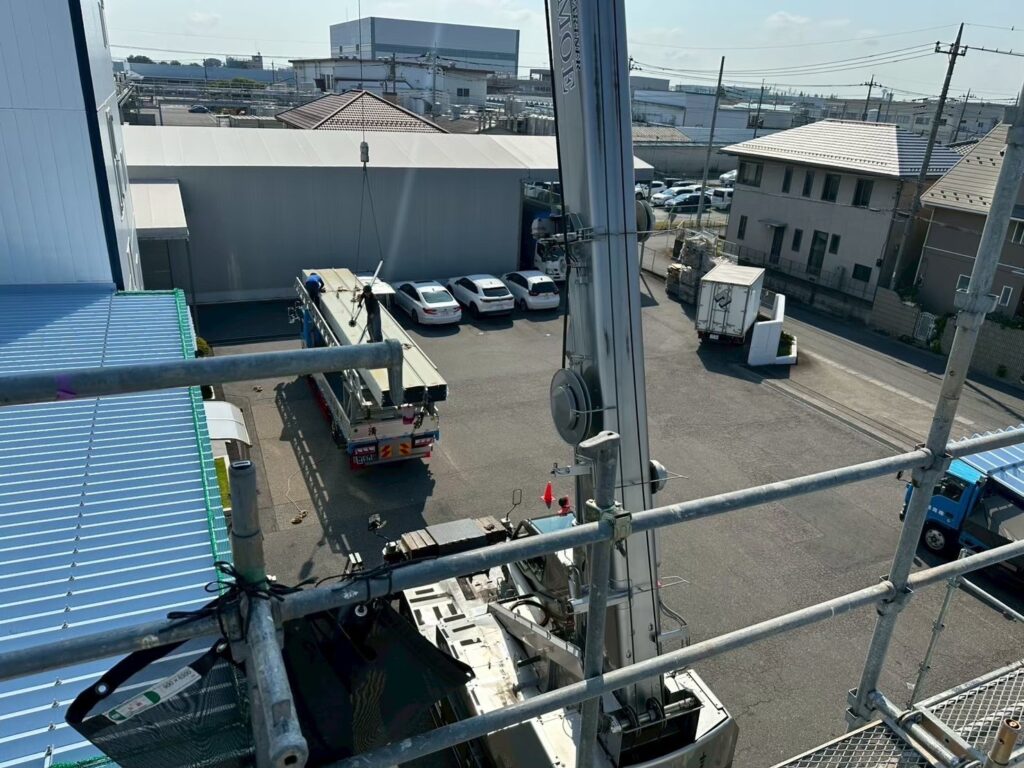 屋根材をレッカーを使用し荷揚げをします。屋根材が10m以上あるので慎重に荷揚げをします。今回使用したレッカーは25トンレッカーです。