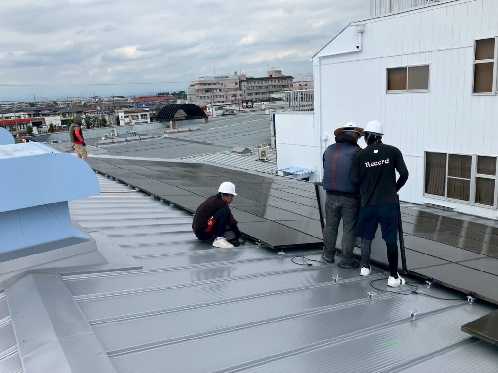 屋根のカバー工事をするに当たりまず既存屋根に取り付けてある太陽光発電パネルを取り外します。