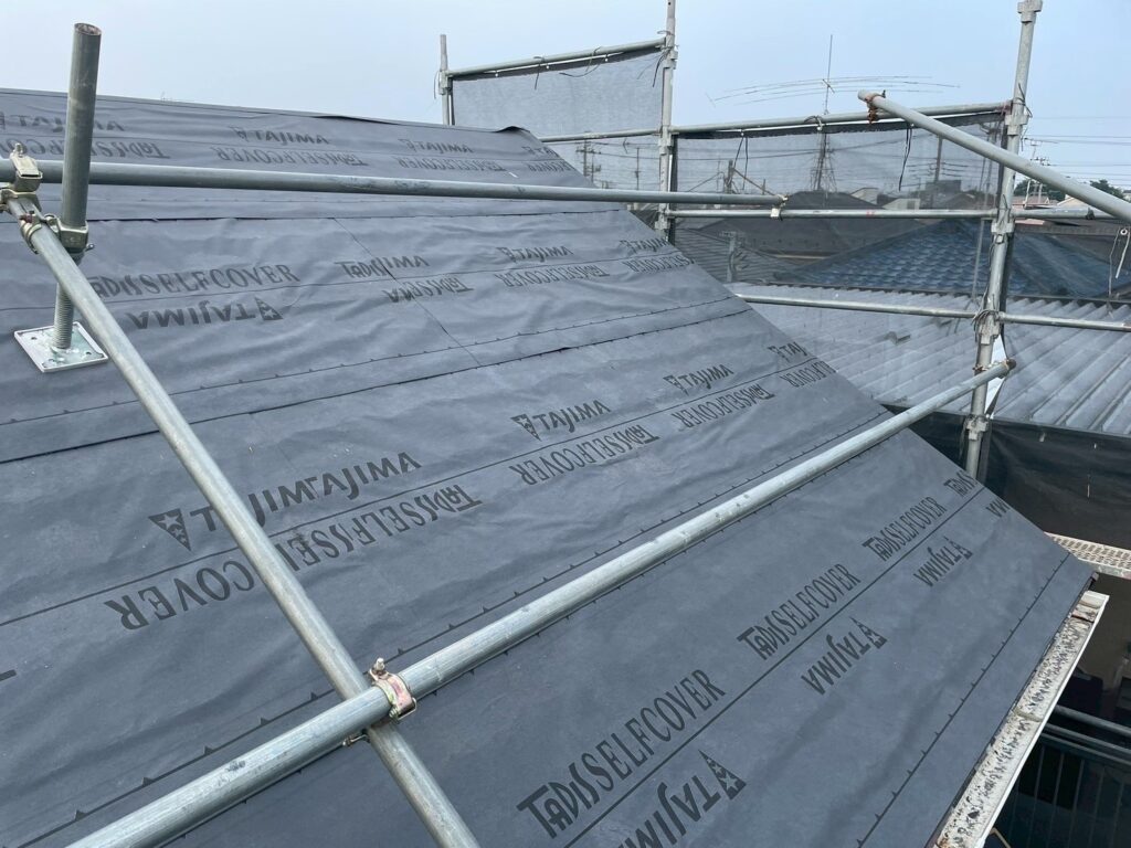 自己粘着性(裏面がベトベトしており屋根材にピッタリとくっ付きます。)の下葺材の為、防水紙を取り付ける際に釘穴を開ける必要がなく屋根カバー工事中に雨漏りの可能性が極めて低い製品を採用しました。